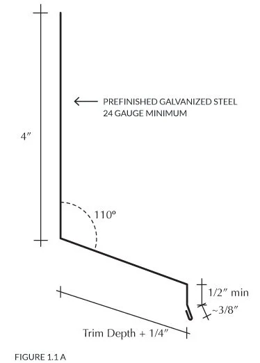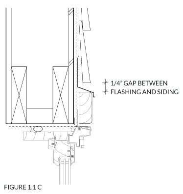 4. Leave a 1/4” minimum gap between cladding termination and sloped metal drip flashings, shown in figure 1.1 C (this detail can also apply to other flashing details such as: belly bands, exterior penetrations, etc.).