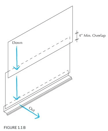 1. Building paper lapping: Install in a shingled fashion with the upper sheet always overlapping the lower sheet by a minimum of 4”. This and the down and out principle shown below.