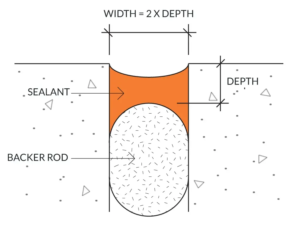 Joint Rule of Thumb: Sealant should be hourglass-shaped and width should be twice depth (shown in diagram).