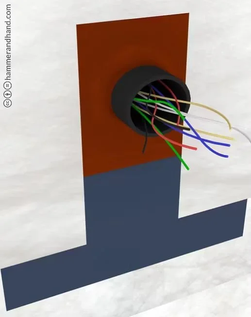 Wires should be consolidated into as few penetrations as possible and routed through a plastic pipe that can easily be sealed (shown below). Allow space for future wiring changes to prevent the creation of future wall penetrations.