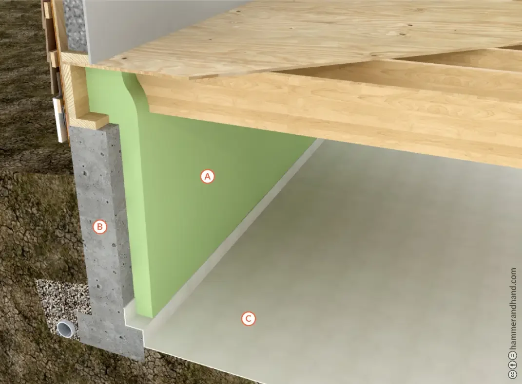 Note: As an option, insulation can be added below the soil barrier. Insulation cannot, however, be added in/below the floor system because this thermal barrier defeats the purpose of a conditioned crawlspace and can set up a dangerous condition where the mechanically vented crawlspace becomes cold enough to produce condensation.