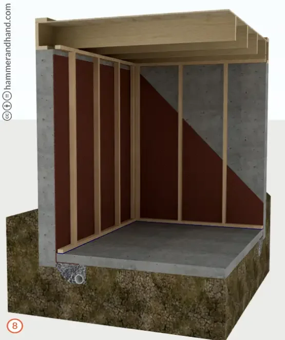 Frame basement wall 1” off wall with a capillary break under bottom plate.