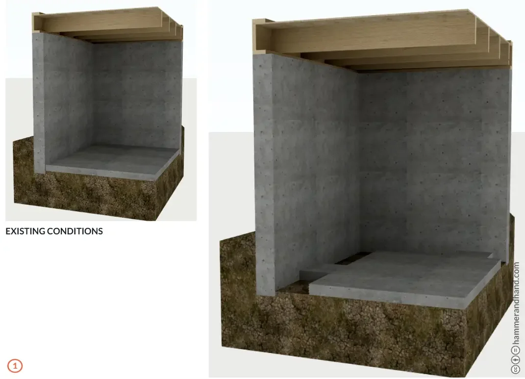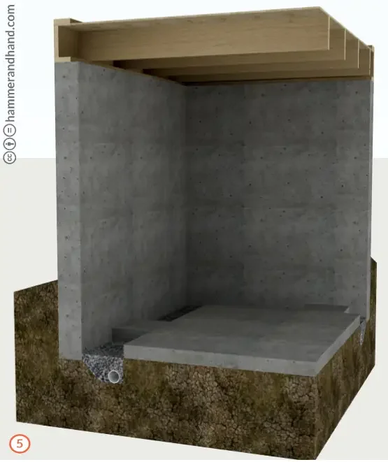 Leave 16” sections of the concrete floor (contact points) every 15’-20’ to keep foundation wall stable.