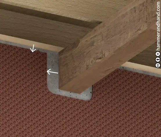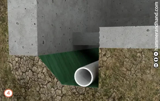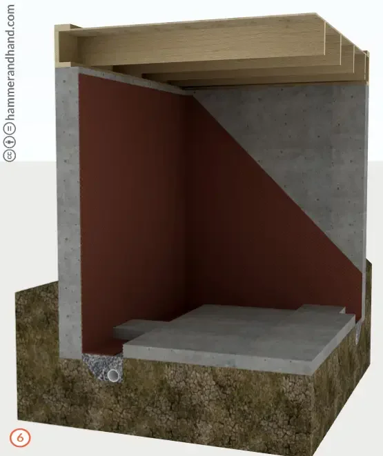 Note: It is critical that dimple drainage mat is terminated before intersecting embedded wood beams and the top of the foundation wall. This prevents the wood from coming into contact with the humid air between the foundation wall and dimple mat.