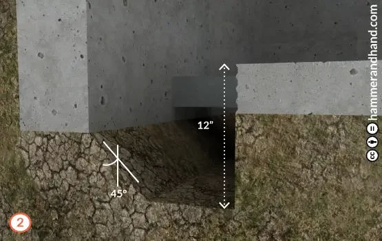 DO NOT undermine footing or foundation wall, maintain a 45 degree angle.
